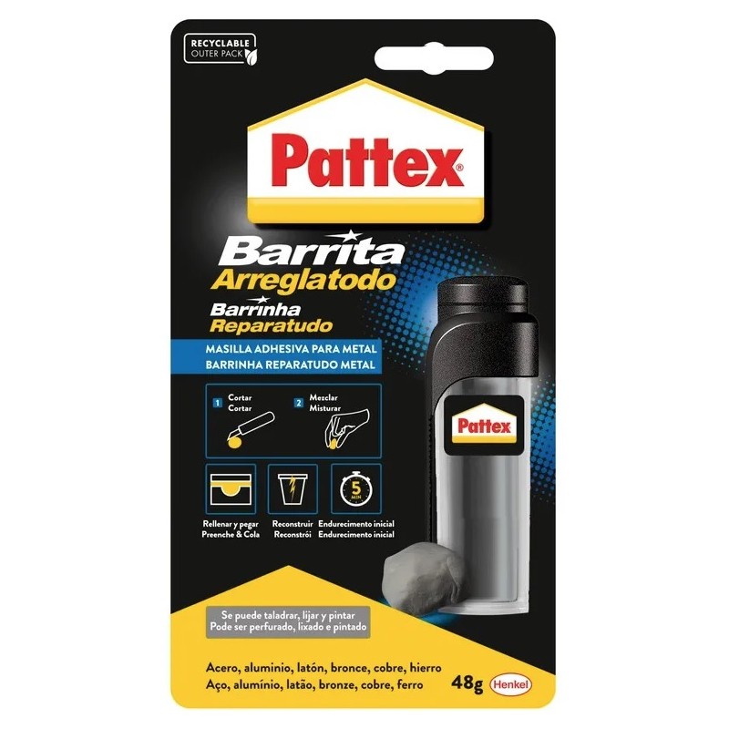 Masilla adhesiva bicomponente para restaurar, reconstruir, sellar, pegar, rellenar y arreglar todo tipo de materiales en el hogar. Su formato permite cortar por dosis para pequeñas reparaciones, y de esa forma conservar, restaurar y reconstruir cualquier objeto de tu casa. Una vez seca, a esta masilla adhesiva se le puede dar el acabado que se desee; por ejemplo, se puede barnizar, lijar, pintar o mecanizar. Ideal para múltiples usos, esta masilla reparadora se seca en solo 5 minutos; una vez endurecido, el adhesivo universal se retira mecánicamente. Contenido: 48 g.