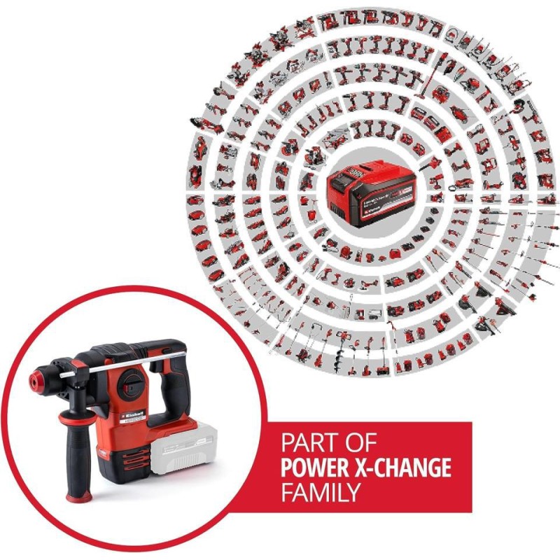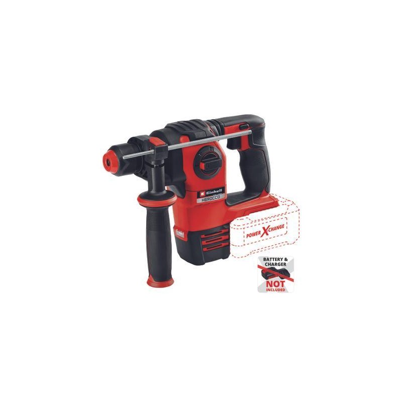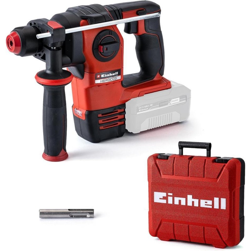 El martillo perforador inalámbrico Einhell Professional HEROCCO 18/20 es un todoterreno muy popular: Ofrece un rendimiento fiable para perforar, martillar o cincelar con o sin fijación. El motor sin escobillas ofrece más potencia y una vida útil más prolongada que los motores de escobillas de carbón convencionales. El mecanismo de impacto neumático trabaja a una tasa de hasta 5500 golpes por minuto y una potencia de 2,2 julios. Los azulejos o ladrillos no tienen nada que hacer cuando se cincelan con la potencia del Herocco. El hormigón y el granito tampoco pueden resistir su fuerza de perforación. El portaherramientas Universal SDS-plus, provisto de mecanismo semiautomático, garantiza un cambio suave de la herramienta. La velocidad electrónica se puede controlar muy bien en trabajos delicados. El manejo es agradable y no causa fatiga gracias a la empuñadura ergonómica con Softgrip. La empuñadura es estable y permite trabajar sin vibraciones y, por lo tanto, con gran precisión. El tope de profundidad de perforación, hecho de metal sólido, se puede ajustar sin límite. El martillo perforador inalámbrico Herocco está provisto de una luz LED para una iluminación óptima del lugar de trabajo. La entrega incluye el adaptador magnético de brocas para atornillar. La entrega se efectúa en un práctico maletín E-Box de transporte y almacenamiento. Diseñado con miembro de la familia Power-X Change, todas las baterías de la serie se pueden usar en los dispositivos de la serie para taller y jardín. La batería y el cargador se venden por separado. Para un trabajo óptimo se recomienda una batería 3,0 Ah Plus o superior.