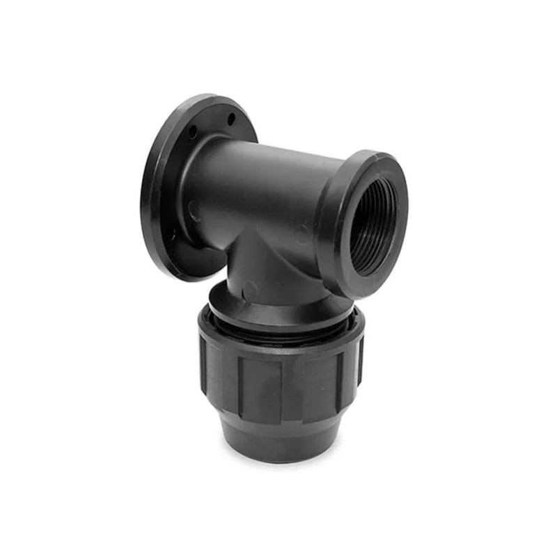 Codo hembra para grifo macho, fabricado en polietileno (PE). Dispone de agujeros para poder empotrar en la pared.